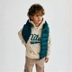 A boys padded gilet designed as a practical outerwear layer suitable for transitional weather conditions. The garment comes in a turquoise shade and features lightweight padded construction for effective insulation. It is equipped with a soft standing collar and a detachable hood lined with jersey fabric, which fastens securely to the neck using snap fastenings allowing for versatile styling options. Elasticated hems and armholes contribute to a comfortable and snug fit while maintaining freedom of movement. The gilet contains hidden side pockets that provide secure storage for small items. A subtle rubber badge detail is positioned on the chest, adding a modest design element. The overall design allows the gilet to be layered over other clothing pieces such as hoodies, adapting well to fluctuating temperatures and casual wear demands.
