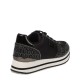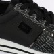 They feature a black and white design with a printed logo pattern and a platform wedge sole.