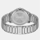 A 43mm stainless steel case, black dial with grey accents and stainless steel bracelet with push button deployment. Water resistant to 3ATM