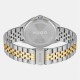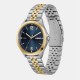 A 43mm stainless steel case, blue sunray dial, gold IP bezel, two tone stainless steel and gold IP bracelet and push button deployment. Water resistant to 5ATM