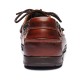 Built like the best classics in nautical footwear, these long-lasting slip on boat moccassins are made of hot stuffed leather conditioned with a rich combination of oils and waxes, then hand-sewn with the finest craftsmanship: waterproof and enhanced by a natural polish quality, they feature a canoe moc construction, leather sock lining, 360° rawhide lace system and non-marking antislip siped soles in a cool innovative dark-brown rubber to offer stable grip in all weather conditions. The ''Endeavour´´ mocs are to brave a life bound to the sea, and are named after HMS Endeavour, the first ship ever used by the British explorer Captain James Cook.