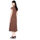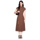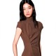 Fit and flare length dress. The collar is slightly raised and has cap sleeves. On the right side, gathering detail and long slit at the bottom. Invisible zip closure on the back and logo button customization.