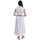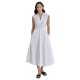 Sleeveless fluid midi shirt dress, V-neck shirt collar. Gathered detail at the waist with side ties and back opening