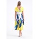 The vibrant abstract print combines bold shades of navy, lime, lilac, and white to create a modern artistic effect, perfect for spring and summer events. A gently flared midi skirt adds fluid movement and balance, ensuring a sophisticated silhouette that flatters every figure.