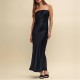 This black bandeau dress channels 90s minimalism. Expertly crafted from satin made from a responsible viscose blend the shape is designed to trace your frame before kicking out with a fluid midi hem. Elevate yours with barely-there sandals. • Concealed zip fastening • Bias cut