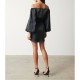 The Pretty Lavish P Fern Off-Shoulder Bardot Mini Dress maintains a compact form. Structured tailoring keeps the profile neat and chic.