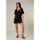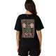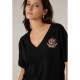 Women´s cotton V-neck T-shirt with a retro tropical floral print and ''Luz del sol´´ lettering. LUZIA Women´s short-sleeved T-shirt made from soft 100% cotton. Designed with a straight fit and a flattering V-neckline, it features a retro-inspired tropical floral print. The ''Luz del sol´´ lettering appears discreetly on the chest and boldly on the back, framed by an ornate design of flowers and palm trees. Turned-up sleeve hems add a neat and fashionable finishing touch, making this piece both expressive and easy to wear.