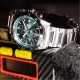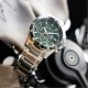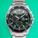 The solid stainless steel band is paired with a bezel and dial in sophisticated grayish green for a stylish look that exudes warmth.