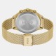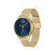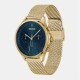 43mm gold IP case, blue dial, gold IP mesh bracelet. Water resistant to 5 ATM.