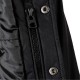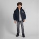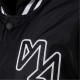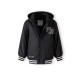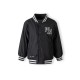 The boys baseball style jacket is a practical outerwear garment designed for boys, suitable for use in moderate weather conditions. It exhibits a classic varsity style characterised by a predominantly black colour with striped ribbed cuffs and a matching waistband that deliver a structured and neat appearance. The detachable hood is made from sweatshirt knit fabric and is secured with buttons. It also features a drawstring, allowing the wearer to adjust the fit precisely. The chest area displays subtle embroidery, providing an understated decorative detail. The jacket includes multiple pockets; these combine zip and snap button closures to ensure small items can be safely stored. The tailored cut promotes ease of movement, rendering it well suited for active use or layering in cooler conditions. No fabric composition information is specified by the manufacturer.