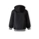 The boys baseball style jacket is a practical outerwear garment designed for boys, suitable for use in moderate weather conditions. It exhibits a classic varsity style characterised by a predominantly black colour with striped ribbed cuffs and a matching waistband that deliver a structured and neat appearance. The detachable hood is made from sweatshirt knit fabric and is secured with buttons. It also features a drawstring, allowing the wearer to adjust the fit precisely. The chest area displays subtle embroidery, providing an understated decorative detail. The jacket includes multiple pockets; these combine zip and snap button closures to ensure small items can be safely stored. The tailored cut promotes ease of movement, rendering it well suited for active use or layering in cooler conditions. No fabric composition information is specified by the manufacturer.