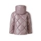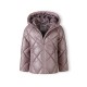 A quilted jacket designed for girls, offering practical outerwear suited for cooler seasons. The jacket features a fixed hood with a high stand collar, providing additional coverage and comfort. It is presented in a lilac colour with a subtle pearl-gloss finish that adds a slight shine to the surface. The relaxed fit and distinctive quilting pattern allow ease of movement. Construction details include a full-length zip with a protective top guard, elasticated inner cuffs to help retain warmth, and two front zippered pockets for secure storage. A decorative heart-shaped badge is positioned on the sleeve, adding visual interest.