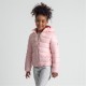 A girls quilted jacket designed for active wear featuring a lightly padded fabric that offers warmth without added bulk. The jacket is primarily pink in colour and includes a high collar intended to protect the neck from cold conditions. It is equipped with a full-length zip closure enhanced by a top zipper guard which ensures secure fastening and ease of use. Elasticated cuffs are designed to keep sleeves firmly in place while the detachable hood adds versatility for varying weather conditions. Practical side seam pockets provide useful storage while maintaining the jacket's streamlined silhouette. A small decorative patch on the sleeve adds a subtle touch of detail. This jacket incorporates protective and functional features suitable for outdoor activities.