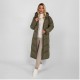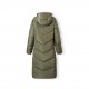 A long, quilted winter jacket designed for women, providing warmth and protection during cold conditions. The jacket features a khaki colour with a fitted silhouette that ensures comfort and coverage. It includes a fixed hood equipped with an adjustable drawstring tape for a secure fit and a high collar to retain heat effectively. A full-length contrasting zip closure allows easy wearing and removal. Elasticated cuffs on the sleeves help prevent cold air from entering, while thick padding and a smooth inner lining deliver additional insulation and heat retention. This jacket is suited for colder weather, offering practical design elements for enhanced thermal comfort.