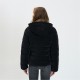 A women's padded jacket designed to deliver warmth and comfort with a luxurious velvet feel fabric in black. It features a fitted silhouette suitable for everyday winter wear. The jacket includes a hood providing extra protection from cold and wind, along with a front zip fastening that allows easy wear and secure closure. Toggle details are added for both functional fastening and aesthetic appeal. Long sleeves with ribbed cuffs offer a snug fit, while side pockets add practicality. Ideal for colder seasons, this jacket combines a stylish velvet texture with functional design elements to maintain comfort in chilly conditions.