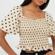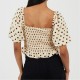 Brave Soul Women's top. Short puff sleeve, square neck and square back. Shirred bust and body, frill to hem. All over polka dot pattern.