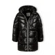 Girls winter coat featuring a shiny quilted black exterior tailored to offer dependable warmth in cold weather. The interior is lined with soft fleece and enhanced with insulating materials to retain body heat efficiently. It includes a hood with a detachable faux fur trim, allowing for adjustable styling and extra protection. A raised collar shields the neck against chilly winds. The coat secures with a front zip and silver-tone snap fastenings for added closure strength. Functional design elements include an upper zip pocket and two flap pockets fastened with snaps, providing storage and convenience. Ribbed cuffs help trap warmth effectively, and the longer cut offers additional coverage and comfort during winter months.