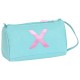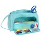 Large format main compartment with zipper. Interior side pockets. Contains 32 pieces: graphite pencil, scissors, pencil sharpener, eraser, 3 pens, fluorescent light, 12 colored markers and 12 wooden markers. Zippered front flap with access to the interior. The flap contains 4 elastics for pens, highlighters and graphite, and a mesh pocket. Side handle.