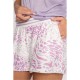 Ivory lounge shorts with lavender leopard print. Includes pockets and side slits.