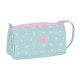 Large format main compartment with zipper. Side interior pockets. Contains 32 pieces: graphite pencil, scissors, sharpener, eraser, 3 pens, highlighter, 12 colored markers, and 12 colored pencils. Front flap with zipper with access to the interior. The flap contains 4 elastic loops for pens, highlighters, and graphite, and a mesh pocket. Side handle