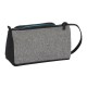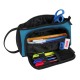 Large format main compartment with zipper. Side interior pockets. Contains 32 pieces: graphite pencil, scissors, sharpener, eraser, 3 pens, highlighter, 12 colored markers, and 12 colored pencils. Front flap with zipper with access to the interior. The flap contains 4 elastic loops for pens, highlighters, and graphite, and a mesh pocket. Side handle