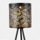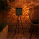 The lamp features a black, patterned casing that casts decorative light patterns when illuminated, creating a beautiful display at night. Powered entirely by solar energy, it charges during the day and switches on automatically at dusk.